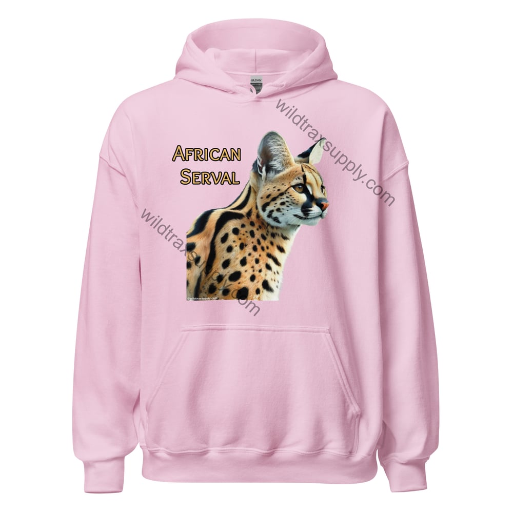 Eye Catching Portait of an African Serval on this hoodie is sure to get everyone's attention! Large gorgeous serval design is printed on the front of this hoodie with the words "African Serval". This is our unique design you will not find anywhere else. This Serval Hoodie will be your new favorite hoodie to get cozy in on cool days! Perfect gift for all Serval and Savannah cat lovers!