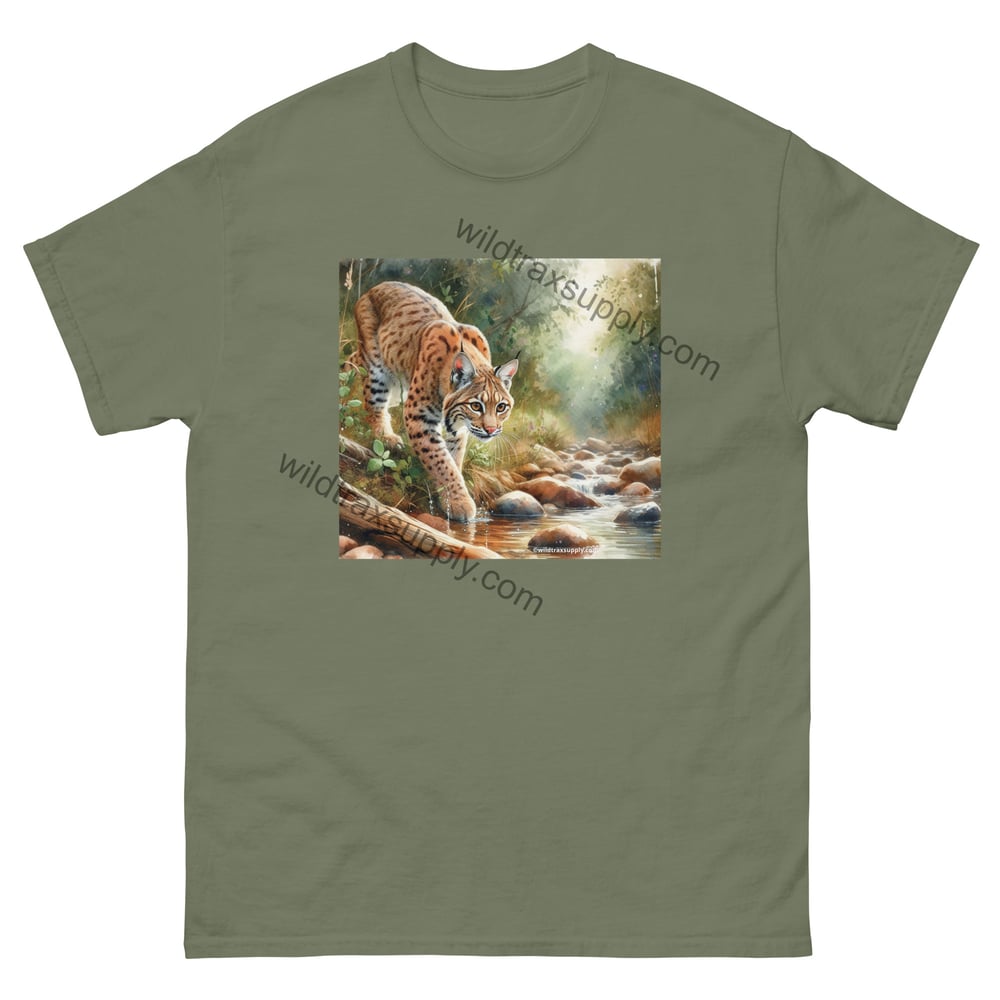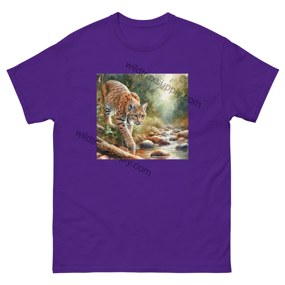 Bobcat lovers will appreciate this gorgeous artwork of the elusive Bobcat wading through a creek in the forest! This is our unique design you will not find anywhere else. It is a full color printed design in a watercolor painted art style.