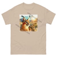 Perfect for African Caracal lovers! This is our unique design you will not find anywhere else! This is a beautiful detailed watercolor painted style design of a mother Caracal with an adorable caracal kitten in their natural habitat. It is a full color printed design featured on the front of the Shirt. The back is blank.