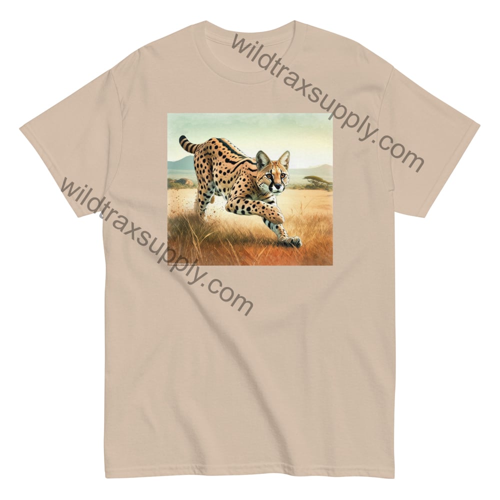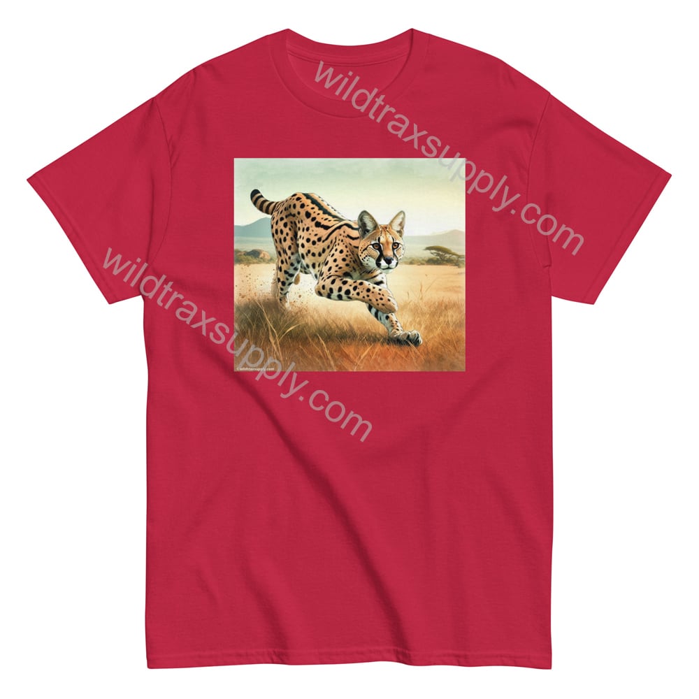 Powerful serval on the prowl! Servals might be a smaller species of wildcat, but what a mighty hunter. Serval admirers will be proud to show off this prowling serval o this Tshirt. This is our unique design you will not find anywhere else. It is a full color printed design in a watercolor painted art style. This design comes in many colors, it looks so good on all of them!